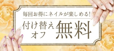 ネイルを付けてから3~4週間後になりますと、ジェルネイルがはがれてくる場合があり、それは付け替えまたはオフをするタイミングでもあります。 ナイスネイルでは、新しいネイルに付け替えされる場合、オフ料金は無料になっておりますので、是非ご利用ください。そのまま放置してしまうと、爪カビの原因になりますので、付け替えまたはオフをお勧めいたします。